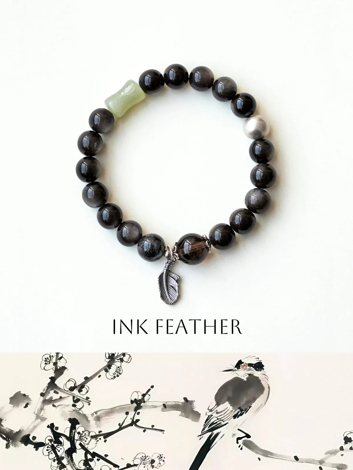 Inspired by a bird ink painting, this bracelet evokes serene freedom and nature’s quiet protection. The feather charm symbolizes aspiration and the pursuit of one’s wishes.
