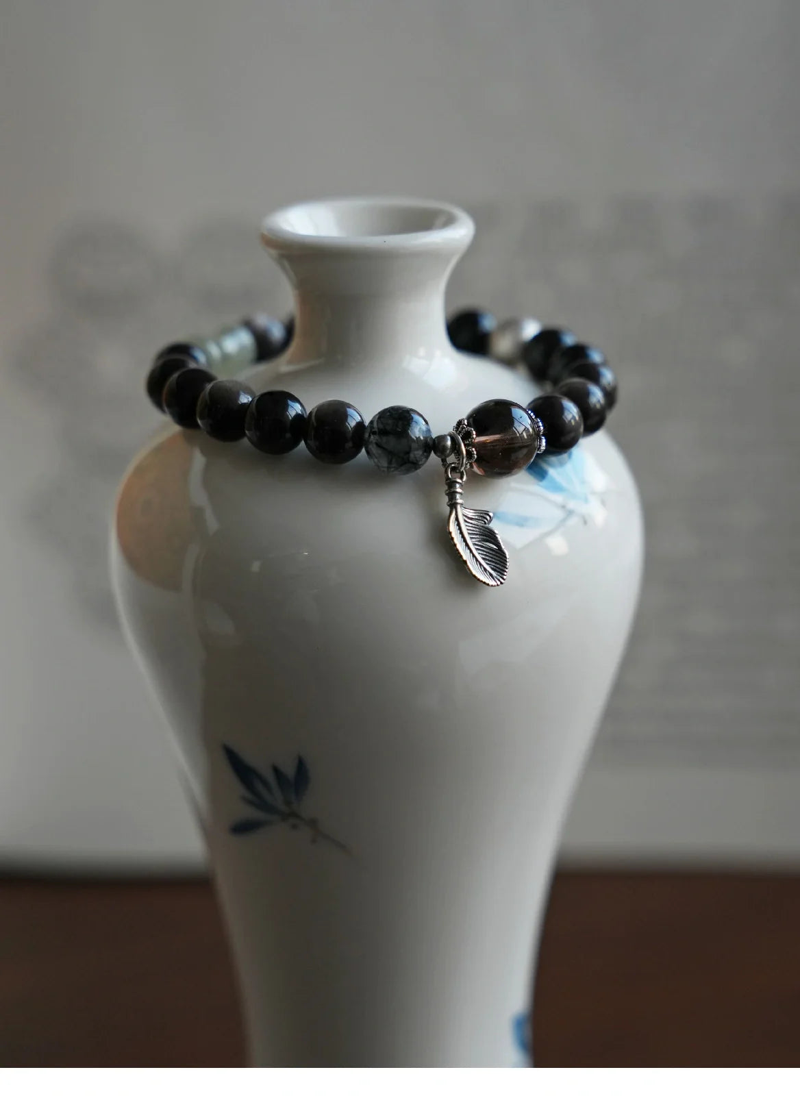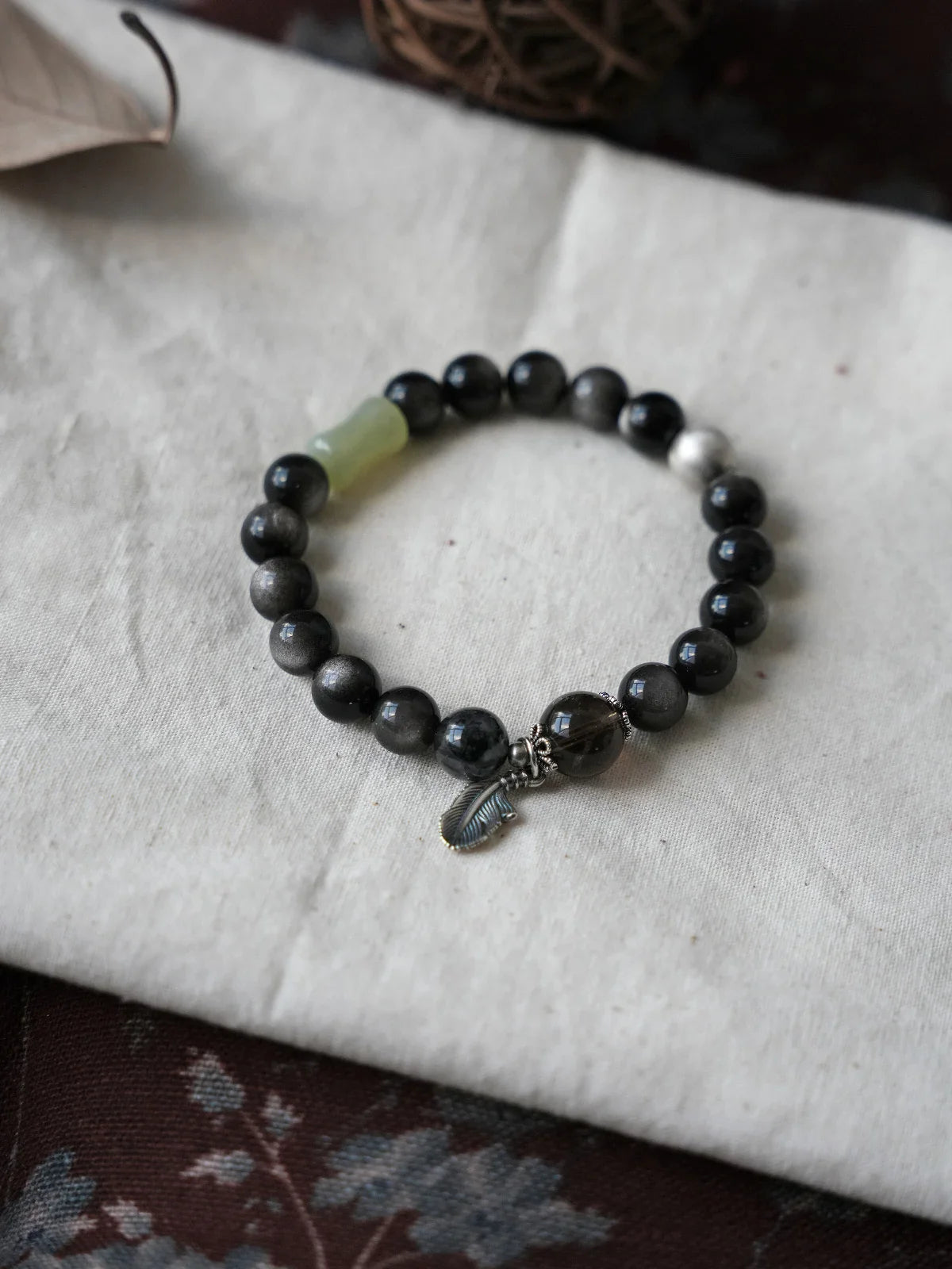 Crafted with obsidian for grounding and protection, Hetian jade for harmony and balance, black rutilated quartz for clarity, and smoky quartz for emotional strength, each bead channels empowerment, calm, and resilience. A symbol of protection, harmony, and inner strength, guiding the wearer toward confident freedom.
